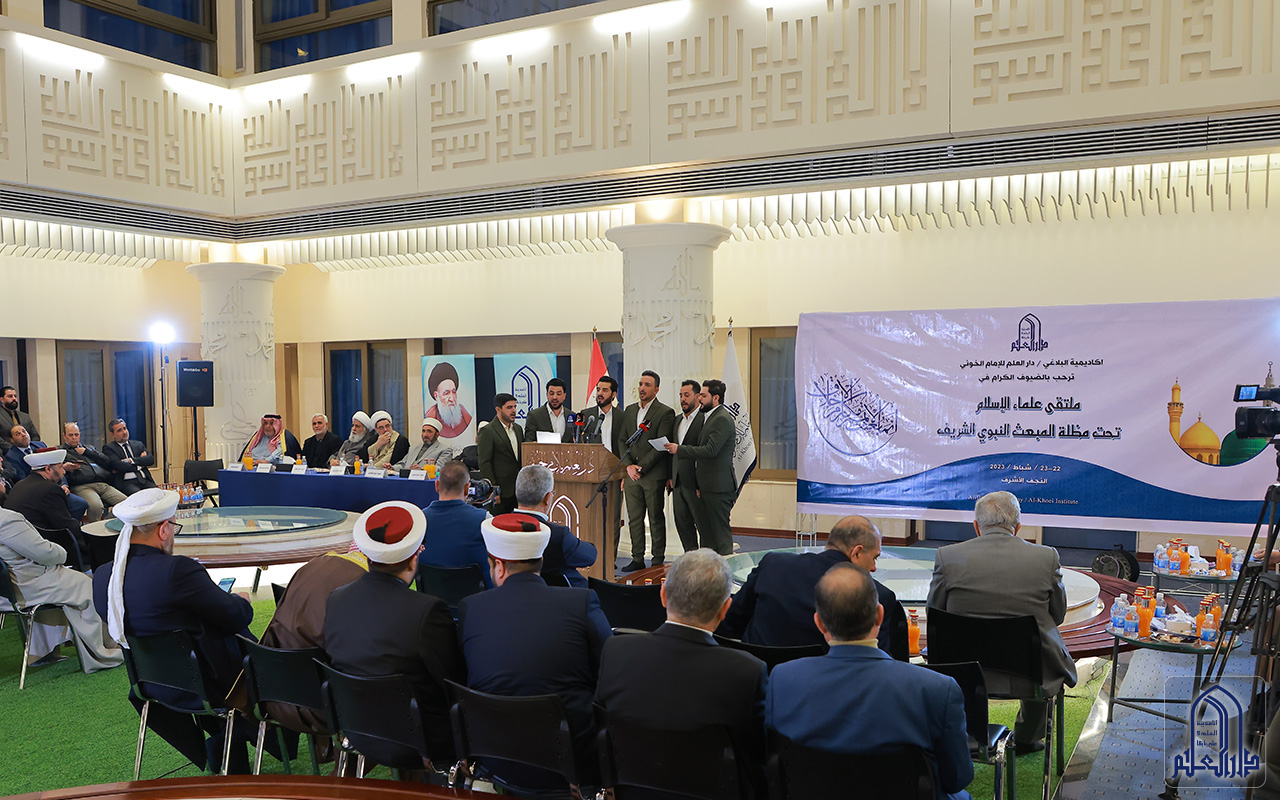 بمناسبة المبعث النبوي الشريف وذكرى الاسراء والمعراج وتحت عنوان ( ملتقى علماء المسلمين تحت مظلة المبعث النبوي ) انطلقت أعمال الملتقى الذي تقيمه أكاديمية البلاغي التابعة لدار العلم للامام الخوئي في النجف الأشرف مساء يوم ٢٢ /٢ /٢٠٢٣ والذي يستمر ليومين إذ افتتح الحفل الذي أقيم في رواق المدرسة واداره سماحة الشيخ ثائر الساعدي بتلاوة آيات من الذكر الحكيم تلاها القارىء الشيخ جاسم النجفي بعده كلمة سماحة العلامة الشيخ محمد الخاقاني بعده كلمة رئيس الوقف الشيعي الدكتور حيدر الشمري ثم كلمة رئيس الوقف السني تلاها الدكتور قتيبه عماش ثم كلمة الشيخ محمد حسين الأنصاري ثم كلمة علماء إقليم كردستان ألقاها الشيخ عبدالله ويسي ثم كلمة المجمع الفقهي العراقي ألقاها الشيخ حسين السامرائي ثم قصيدة شعرية للشاعر الشيخ عبدالله الخاقاني ثم كلمة رئيس جمعية رابطة العلماء في العراق تلاها الشيخ حامد الحياني.