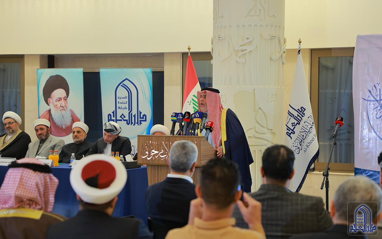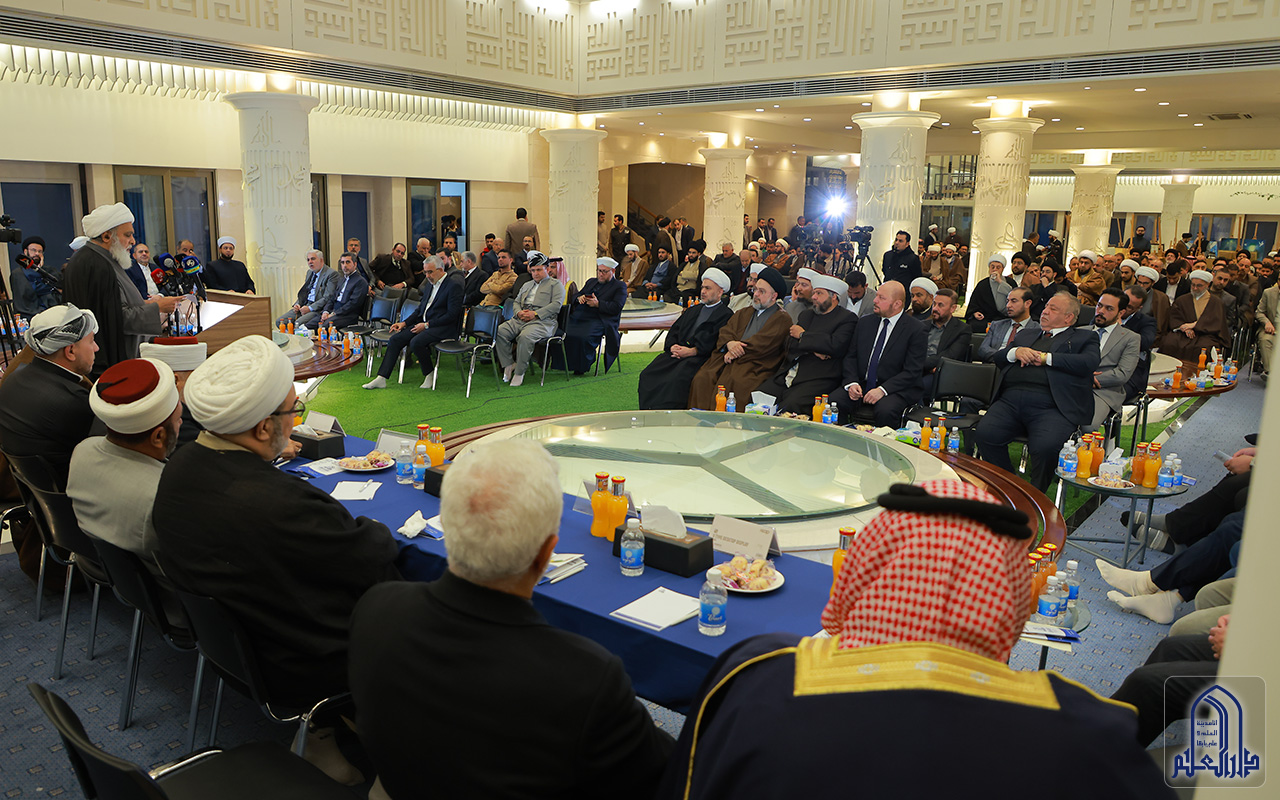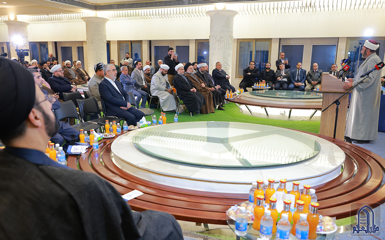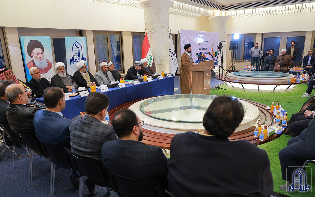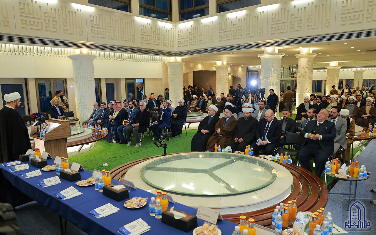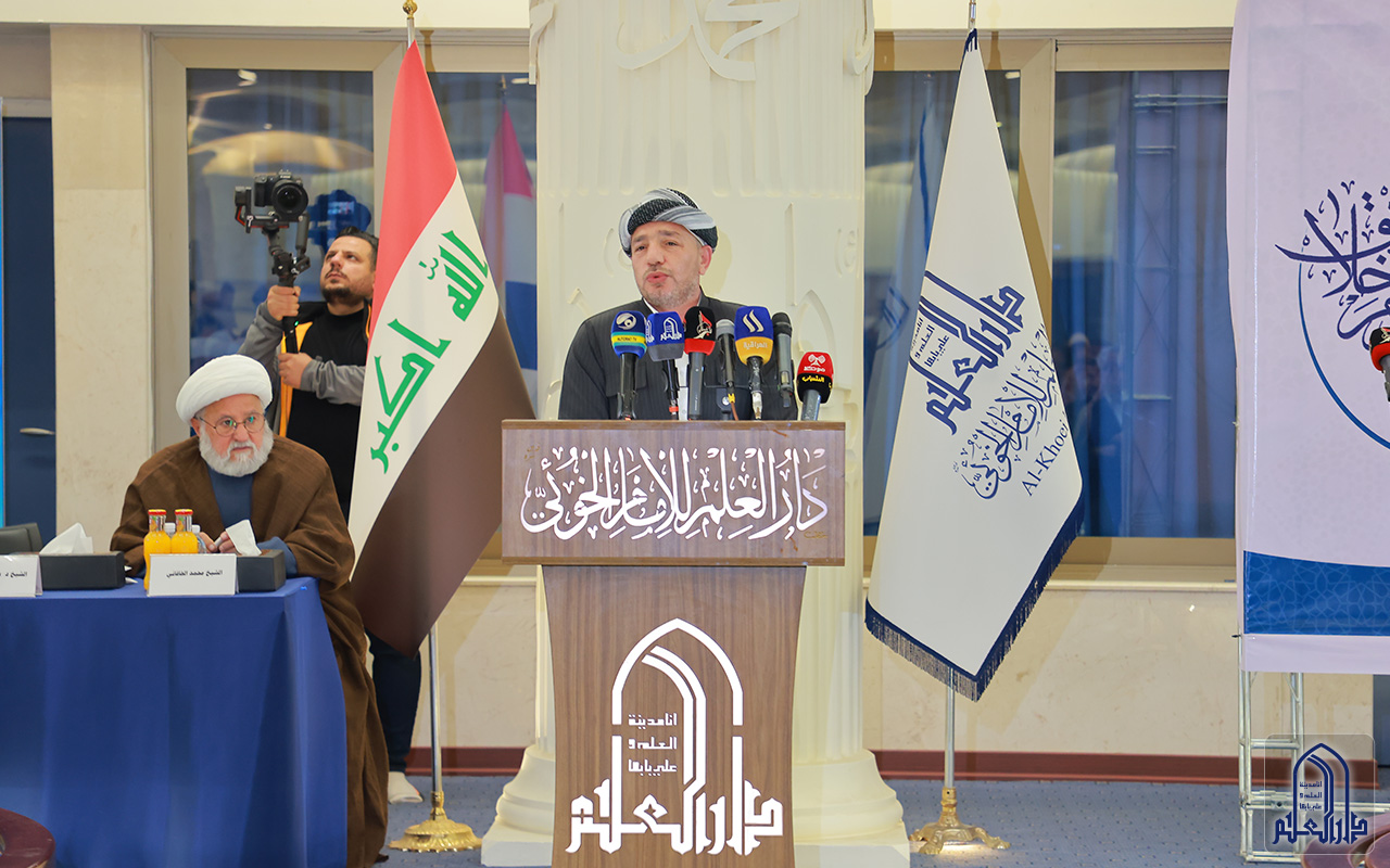 وفي الختام كلمة دار العلم التي رحب بها سماحة السيد جواد الخوئي شاكرا الضيوف والحضور الكريم، ومباركا للجميع مناسبة المبعث النبوي وذكرى الاسراء والمعراج ومما جاء في كلمته: (نعم، فرضت الظروفُ السياسيّةُ والجرائمُ الإرهابيةُ بيئةً عملت على تشتيتِ شملنا، وحاولت بثَّ الفُرقةِ بيننا، ولكنْ أيُّها السادةُ علينا أن نعِيَ أنّنا في قاربٍ واحدٍ، وأنّ ما يجمعُنا ويُقرِّبُنا مع بعضٍ أكثرُ ممّا يُفرِّقُنا، وكما يقولُ المرجع الأعلى السيّدُ السِيستاني في هذا المجالِ: (إنّ المشترَكاتِ هي الأساسُ القويمُ للوَحدةِ الإسلاميّةِ، فلا بدَّ من التركيزِ عليها لتوثيقِ أواصرِ المحبّةِ والمودّةِ بينَ أبناءِ هذهِ الأمّةِ، ولا أقلَّ من العملِ على التعايُشِ السِلميِّ بينهم مبنيًّا على الاحترامِ المتبادَلِ وبعيدًا عن المشاحَناتِ والمهاتَراتِ المذهبيّةِ والطائفيّةِ أيًّا كانتْ عناوينُها فينبغي لكلِّ حريصٍ على رِفعةِ الإسلامِ ورُقِيِّ المسلمينَ أن يبذُلَ ما في وُسعِهِ في سبيلِ التقريبِ بينهم والتقليلِ من حجمِ التوتُّراتِ الناجمةِ من بعضِ التجاذُباتِ السياسيّةِ لِئَلّا تُؤدِّيَ إلى مزيدٍ من التفرُّقِ والتبعثُرِ، وتفسَحَ المجالَ لتحقيقِ مأربِ الأعداءِ الطامعينَ في الهيمنةِ على البلادِ الإسلاميةِ والاستيلاءِ على ثرَوَاتِها)، فالآخَرُ من الأديانِ الأخرى لا يُميِّزُ بينَ مَن هو مسلمٌ شيعيٌّ ومَن هو مسلمٌ سنّيٌّ، فَلْنَدَعْ اختلافاتِنا الفقهيّةَ والعَقَدِيّةَ داخلَ الحلقات العلمية في البيتِ الإسلاميِّ خاصّةً، والقرآنُ الكريمُ يدعو الإنسانَ إلى التفكُّرِ فيما يتبنّى من آراءٍ ومعتَقَداتٍ فجعَلَ الإيمانَ بالأصولِ الاعتقاديّةِ أمرًا خارجًا عن التقليدِ، فلا يَجعلُ نفسَهُ أمامَ اتّجاهٍ واحدٍ إجباريٍّ، ولا ينغلقُ على موروثاتِهِ من آبائِهِ وأسلافِهِ من دونَ دراسةٍ وتمحيصٍ، وهكذا نصِلُ إلى تحقيقِ ما أمرَنا اللهُ بهِ من كونِنا أمّةً واحدةً، وهو هدفُ تجمُّعِنا هذا).